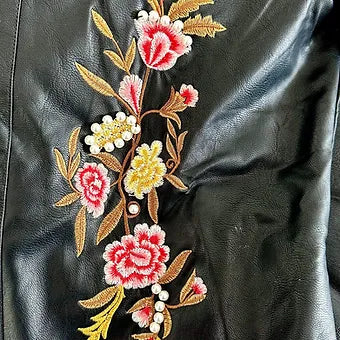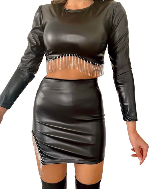 Black Leather Long Sleeve Crop Top and Mini Skirt Set with Crystal Fringes
