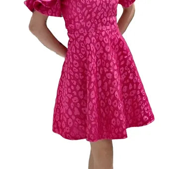 Fuchsia Off the Shoulder Leopard Print Ruffle Dress